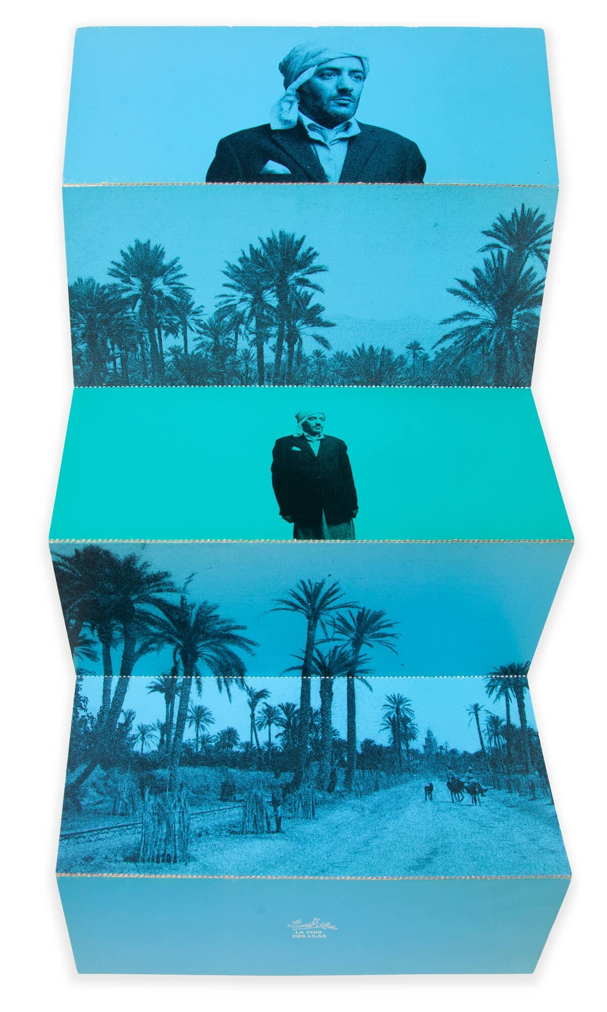 Un peu de poésie dans le désert⁠… ⁠ Illustration pour la biographie de Rachid Taha , un objet collector – une carte postale/souvenir détachable – à envoyer aux siens, à ceux qu’on a quittés.