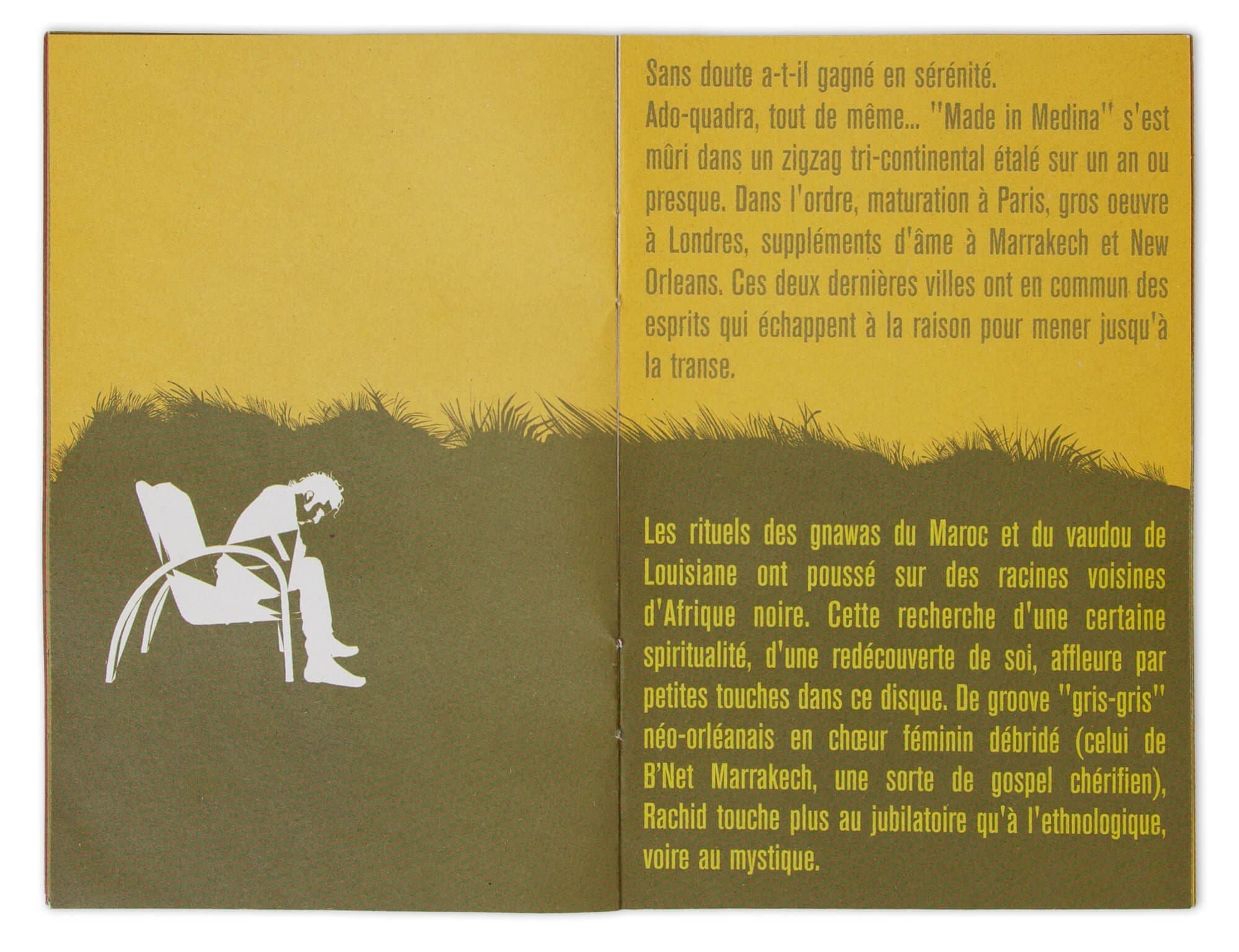 Année 2000, du punk berbère hypnotique… À l’occasion de son album Made in Medina, le studio réalise ce petit bijou, une micro-édition… un conte illustré, intime, dans les pas du bohème, Rachid Taha.