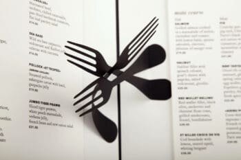 the waouh effect, c’est une chemise noir ou rien n’est inscrit. À l’ouverture les fourchettes se dressent les fouchettes comme si elles etaient prête a démarrer le diner, Un sorte de mise en apétit. Ce menu a aujourd’hui 10 ans et c’est une signature, c’est un de nos travaux préféré. Des…