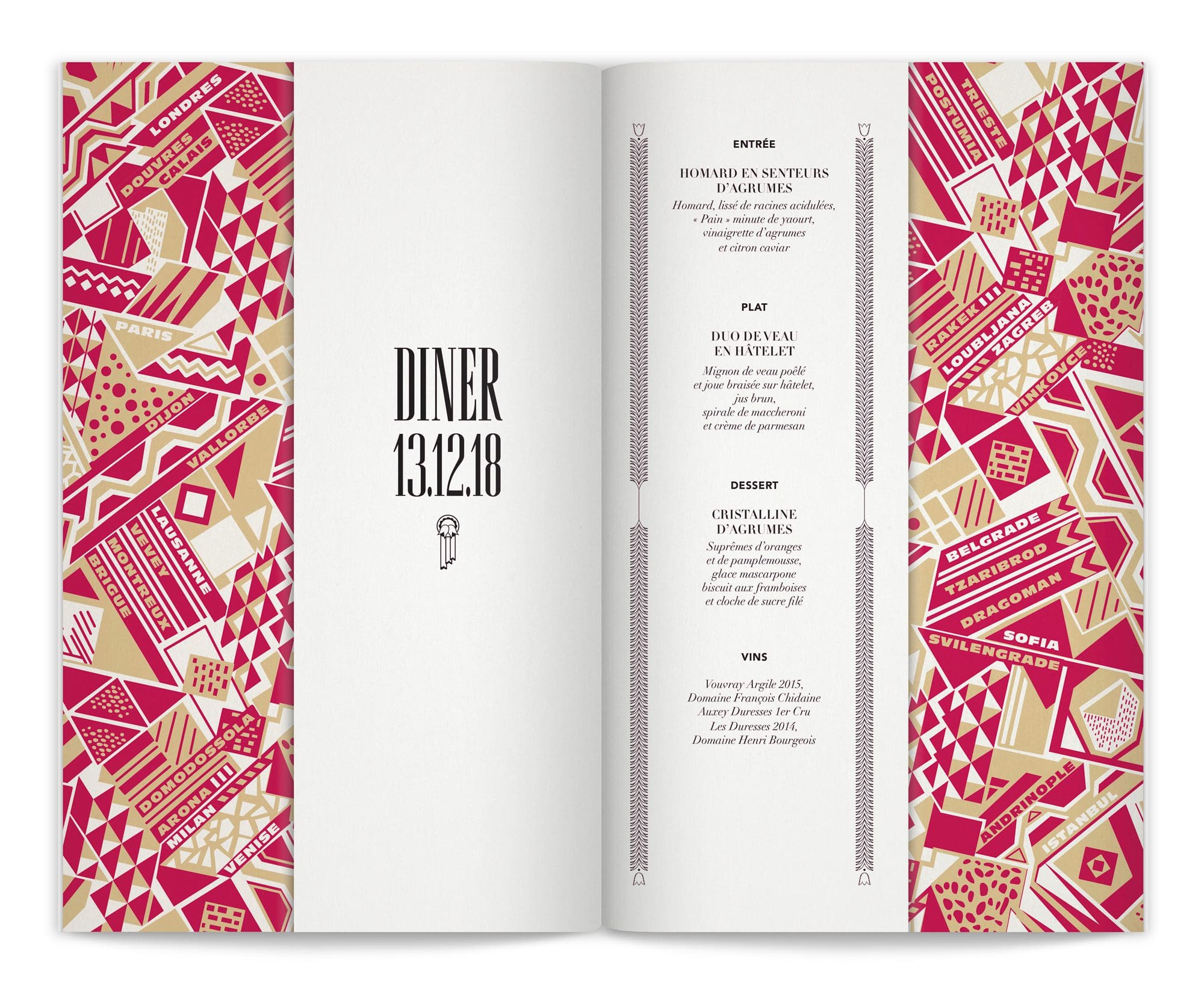 Pour orner la couverture extérieure et les pages intérieures du menu, Le studio réinterpréte des motifs d’époques, ils puisent leurs inspirations dans les moquettes et les rideaux de velours des voitures étoile du nord et Riviera!