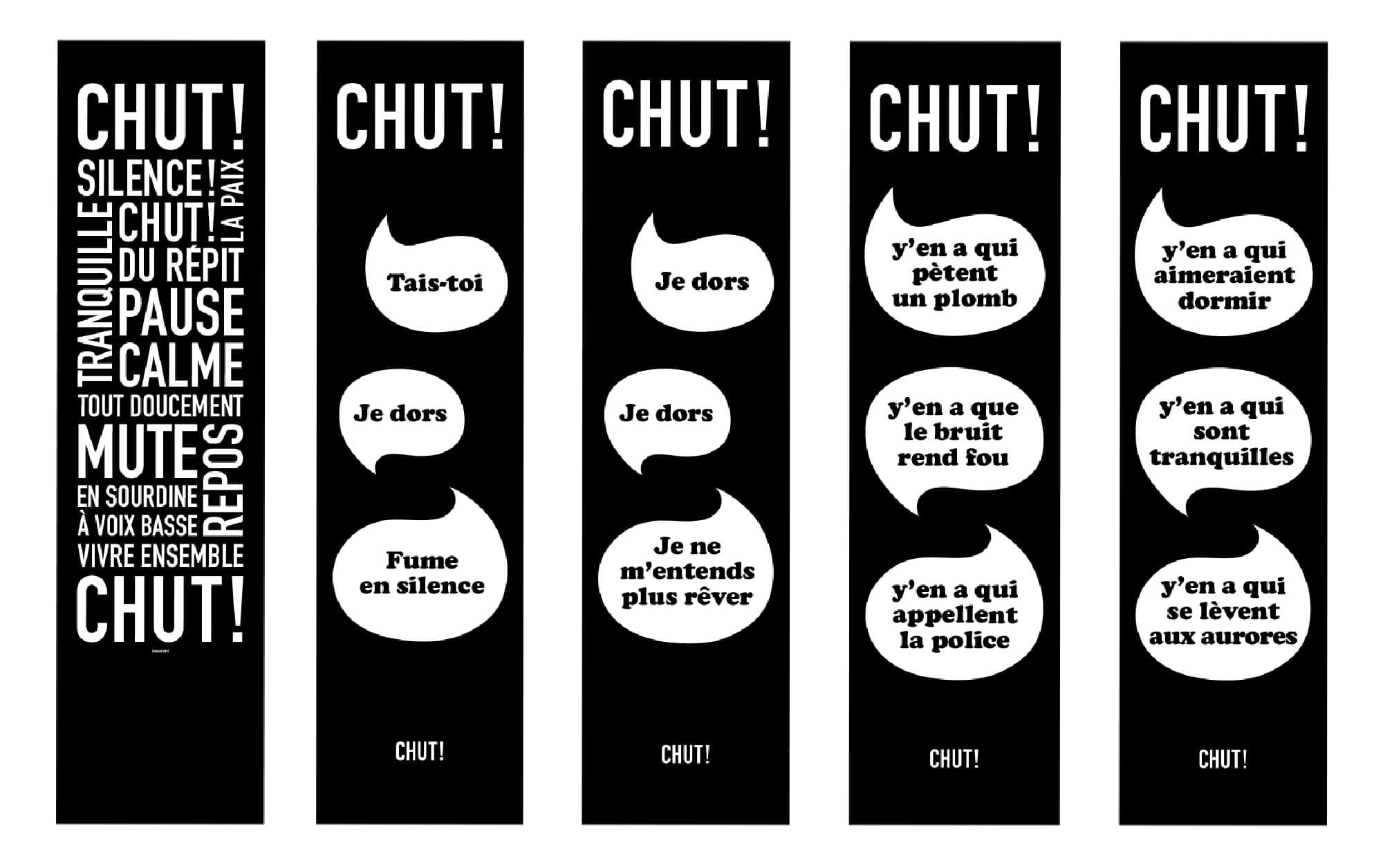 C’est en étudiant la complexité de ces relations qu’Ich&Kar imagine un outil citoyen de sensibilisation : Les drapeaux Chut ! Des bannières destinées aux oiseaux de nuit qui doivent comprendre qu’ils ne sont seuls. Sur chaque bannière est imprimé au recto la déclinaison du vocabulaire du silence (chut pause, calme, en sourdine…) au verso un dialogue de bulles, expression du dialogue de sourd entre fêtards et couche-tôt. C’est avec humour et légèreté qu’elles rappellent au respect simple du vivre ensemble. Cet outil comme une piqûre de rappel au savoir vivre va dans le sens d’un souhait fort des riverains.