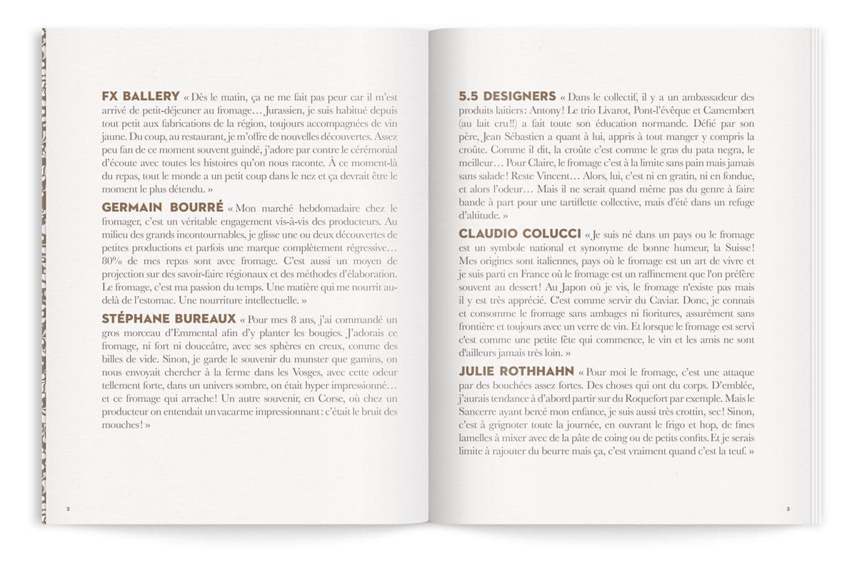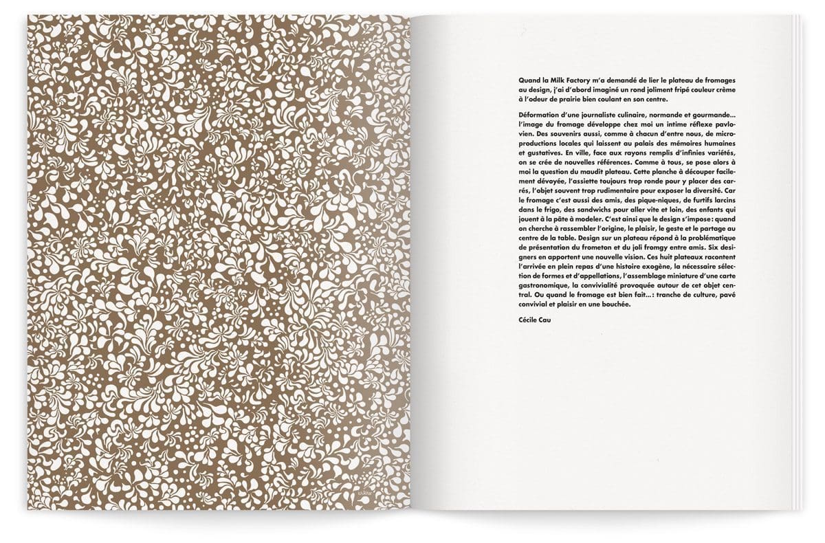 Le fromage, comment le présenter ? Six designers qui ne se satisfont ni de banales assiettes ni des courants plateaux, planchent sur la question. Soucieux de transmettre l’histoire, de refléter la richesse, de montrer la diversité et de coller aux pratiques de table actuelles, ils répondent en huit plateaux. Les matières utilisées et les usages envisagés mettent tous en exergue le partage et la convivialité qu’occasionne le fromage.