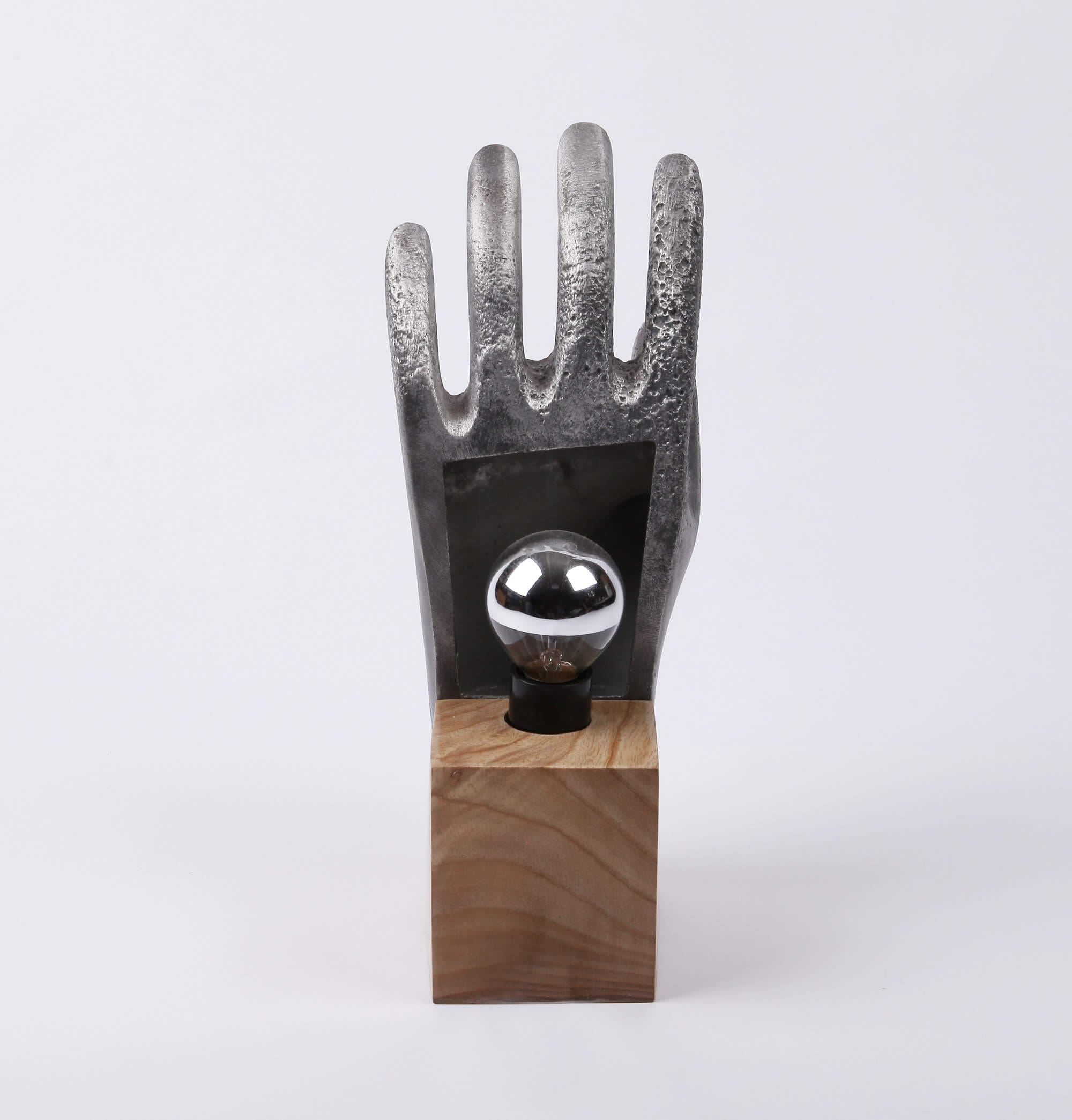 Ich&Kar nourrit une véritable passion pour les mains : outils de travail, il semble souvent aux graphistes qu’ils n’en n’ont pas assez, c’est sans doute pour cela qu’ils les collectionnent… À partir d’un moule de gants, ils conçoivent une lampe étonnante, où les matières chaudes et froides se rencontrent.