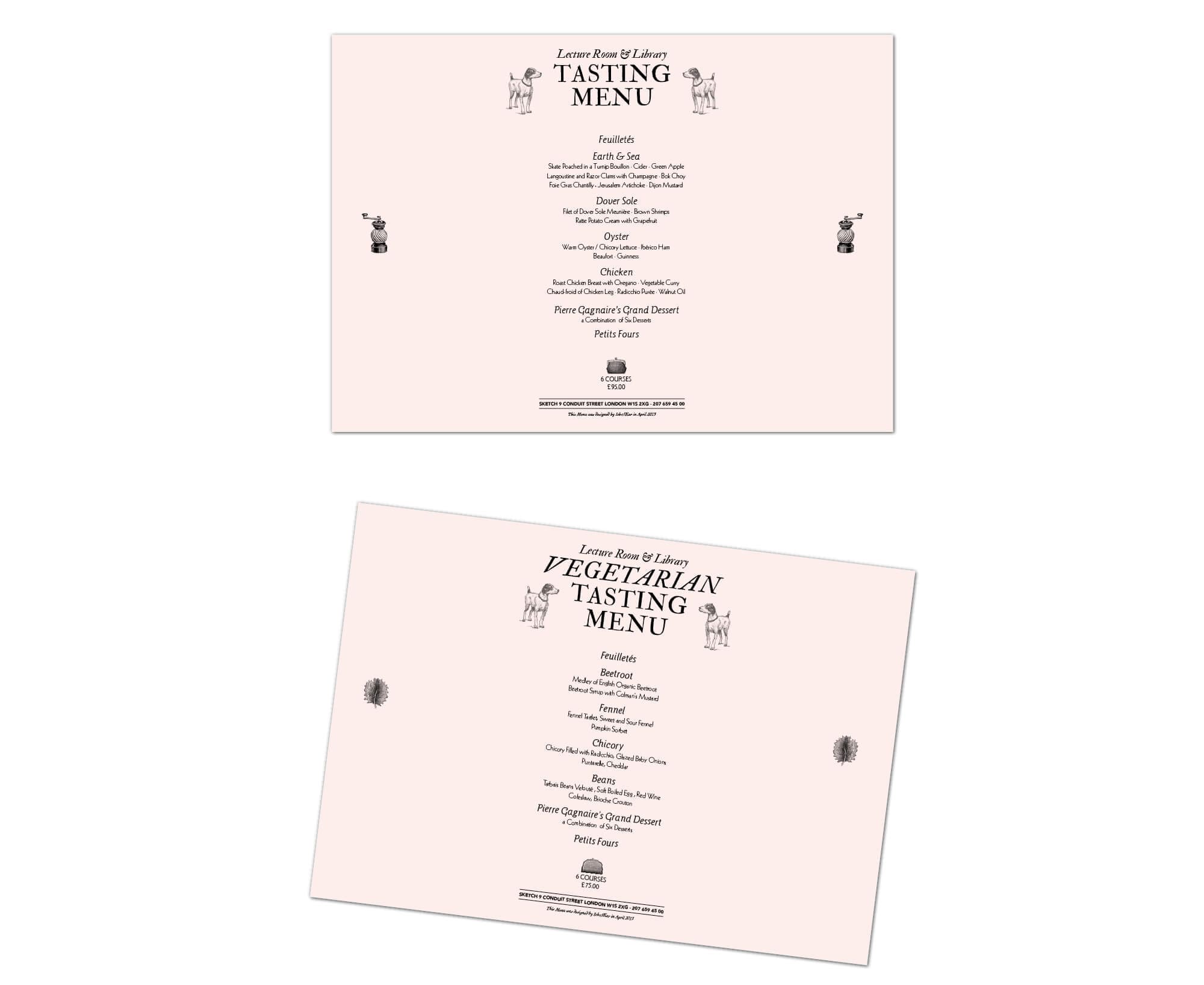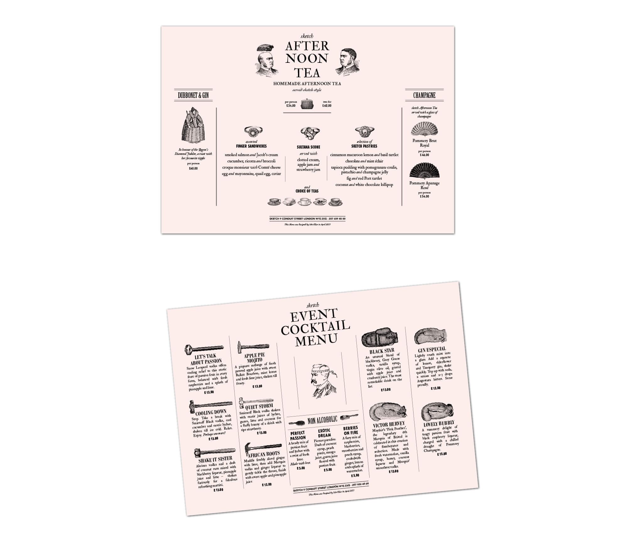 La papeterie La conception d’une identité visuelle vient souvent après tout le reste dans la restauration, car la priorité est souvent mise sur les objets directement en contact avec le public, comme le menu ! Pour le Sketch, Ich&Kar conçoit d’abord des boîtes à gâteaux. Mais de fil en aiguille, il a fallu construire une identité en cohérence avec les lieux. Pour le papier à lettres, enveloppes et cartes de visite du Sketch, les graphistes dessinent des documents avec une marge rose de quelques millimètres à peine. L’impression relève de la véritable prouesse technique ! Mais Ich&Kar aime les défis, et sait s’entourer de bons imprimeurs. Sur l’enveloppe, on retrouve le rose iconique à la manière d’un cartouche où l’adresse vient s’inscrire.