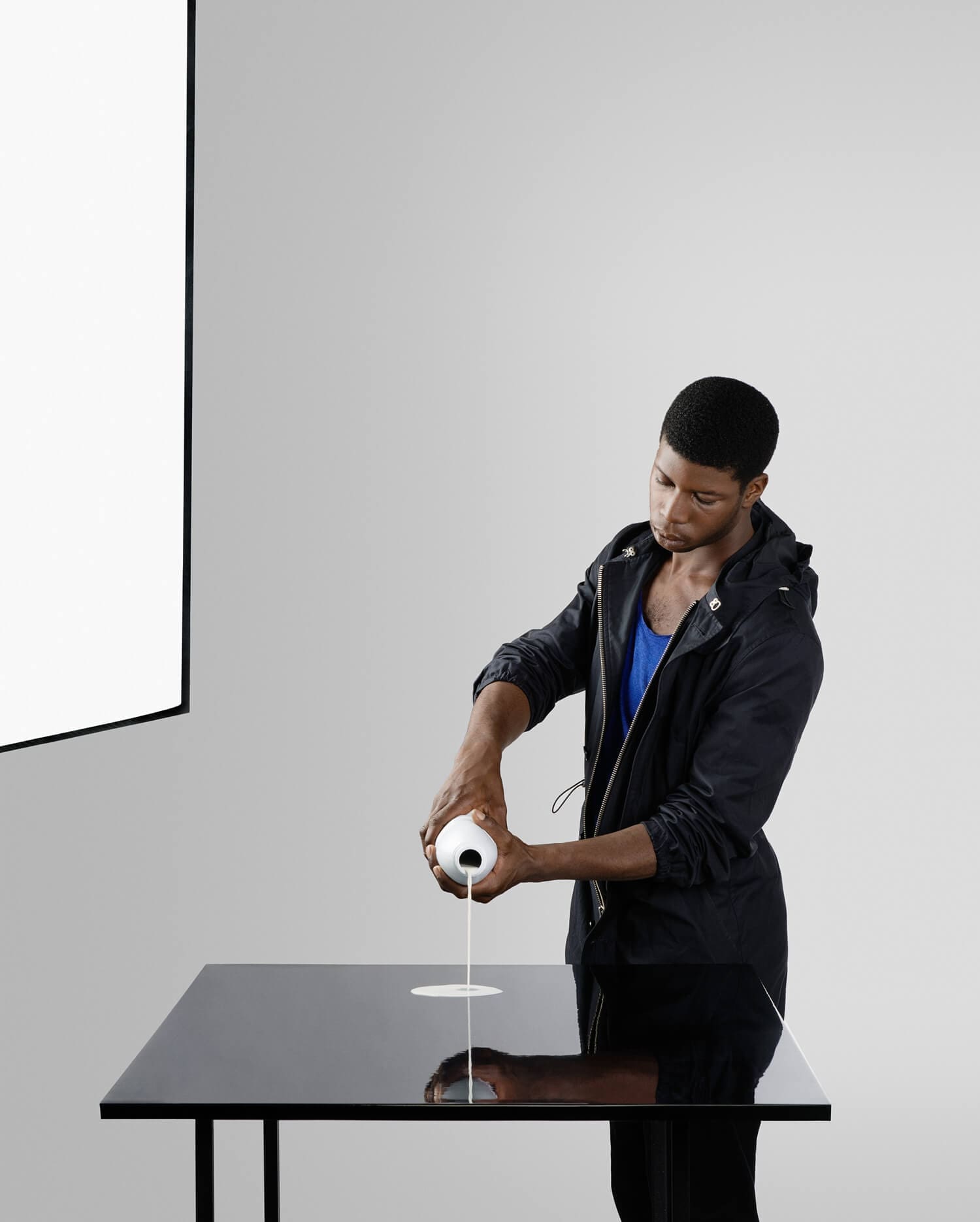 Colombe a donc choisi cette incontournable et évidente référence pour en extraire l’essence de la composition. La Laitière gironde est ainsi détournée en laitier habillé trendy, l’action de verser reste inchangée sauf que les objets sont ancrés dans notre quotidien du XXIe siècle et la fenêtre a ici été remplacée par une boite à lumière. La quiétude est au rendez-vous comme si la douceur du geste traversait les siècles.