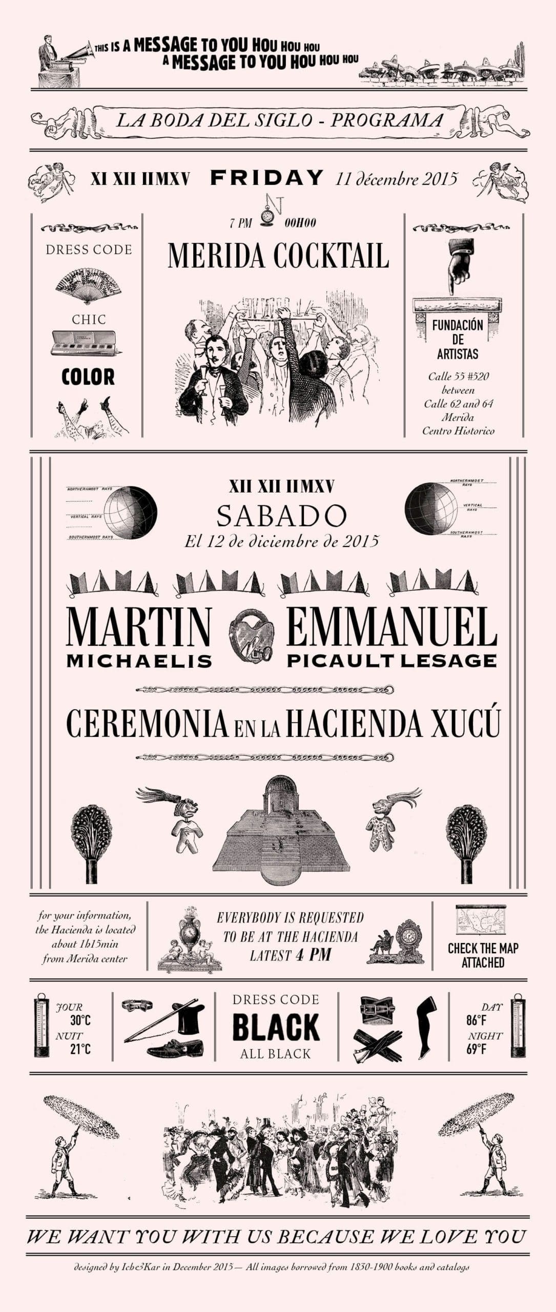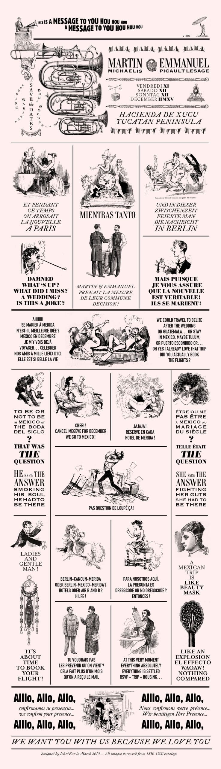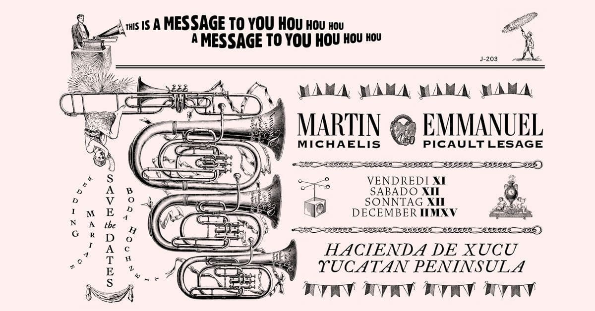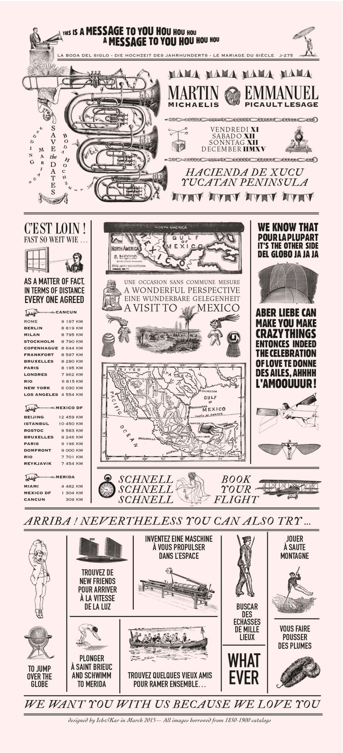 Martin Michaelis et Emmanuel Picault se marient. Tous deux vivent au Mexique, Emmanuel depuis plus de vingt ans, Martin l’y a rejoint il y a peut-être deux ou trois ans. Leurs amis viennent du monde entier: France, Allemagne, Suède, Italie, Islande, Amérique… il fallait donc un faire-part polyglotte, un faire-part qui donne envie de faire le voyage… Ensemble nous avons décidé que nous utiliserions le mail, que nous reviendrons à la charge deux ou trois fois avec de petites histoires surréalistes, amies lointaines des histoires pensées pour le sketch… une poésie exotique pour un mariage enflammé en somme !