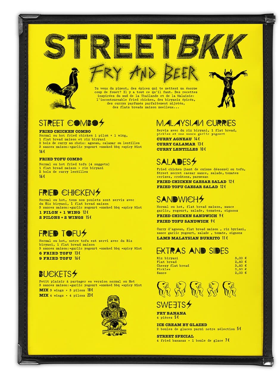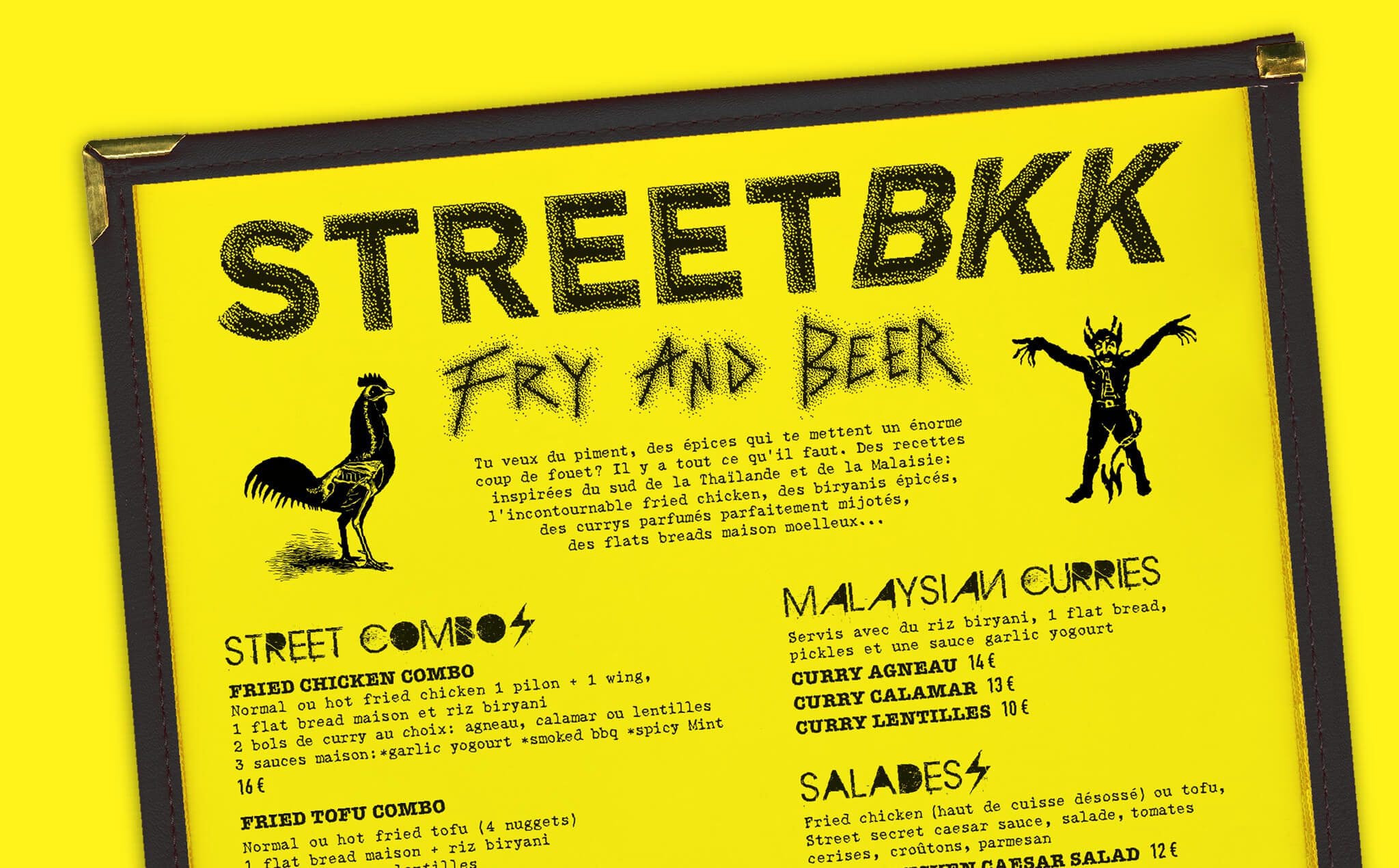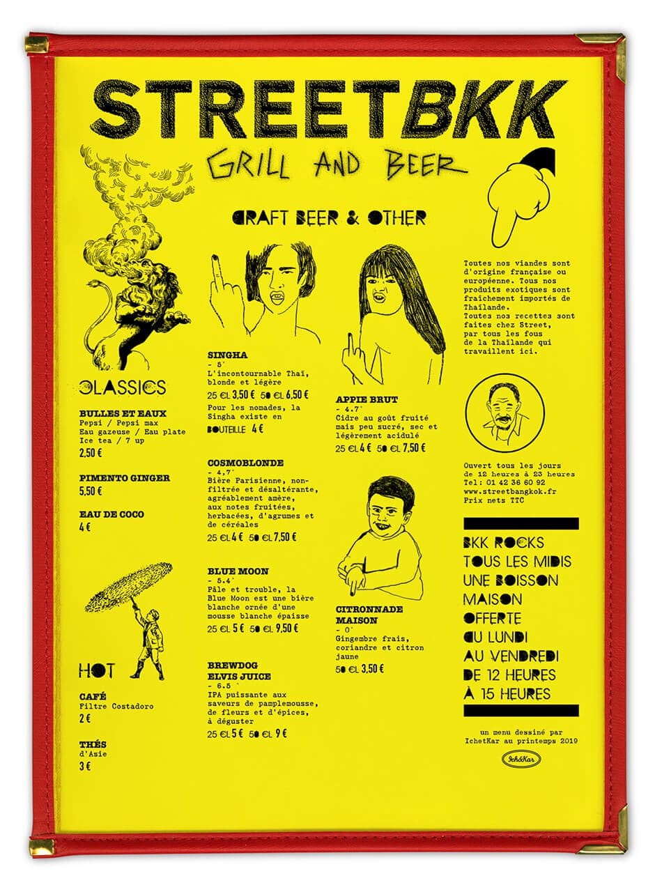 Pour Street Bangkok, Ich&Kar dessine des menus punk flashy, qui font la part belle aux typographies trash. Un travail calibré qui surfe sur les codes du fanzine Punk avec une iconographie excentrique et pimentée.