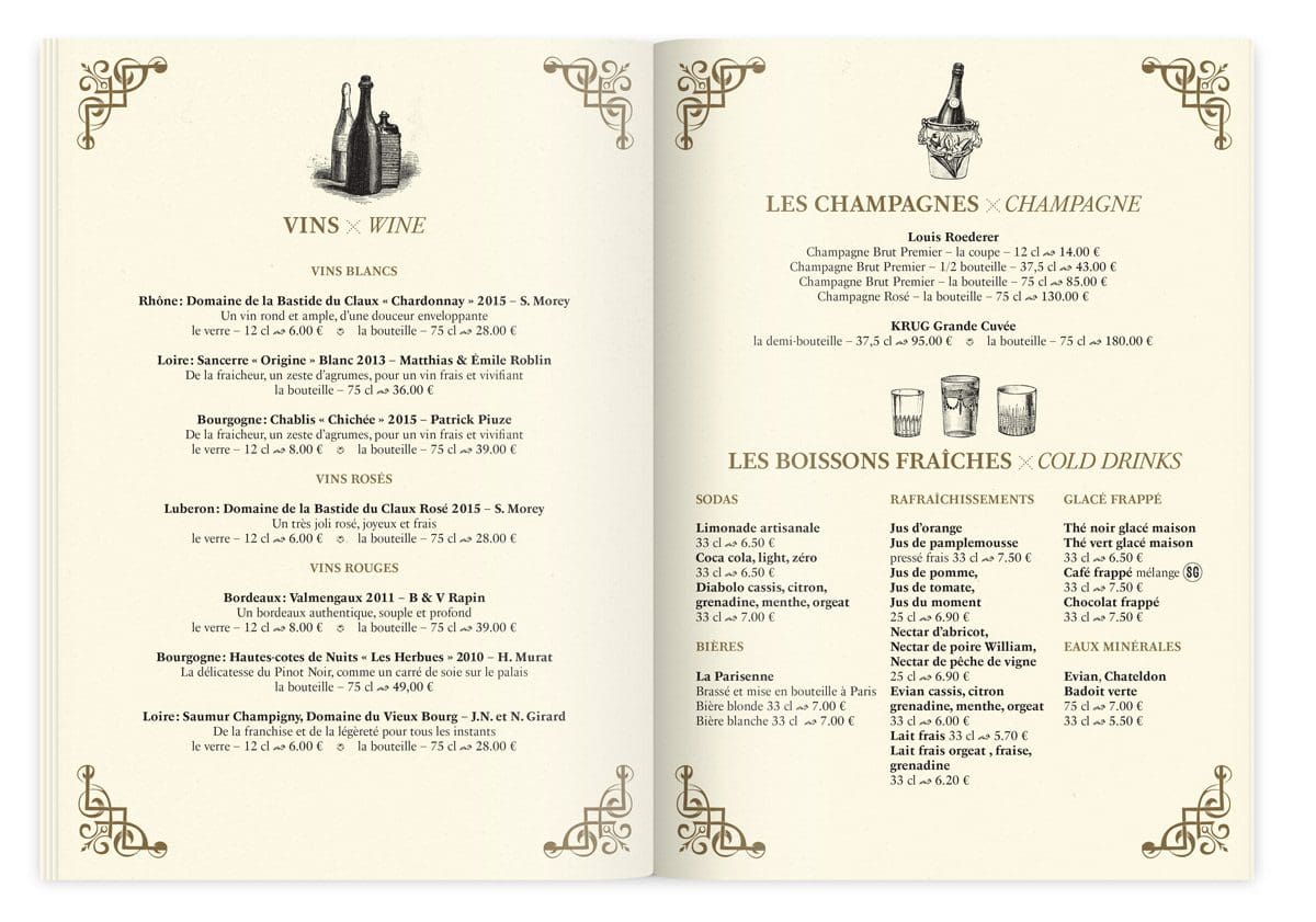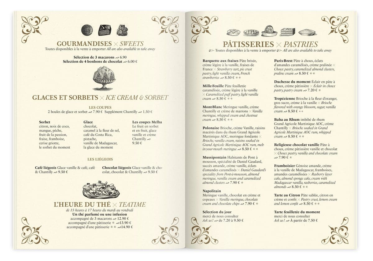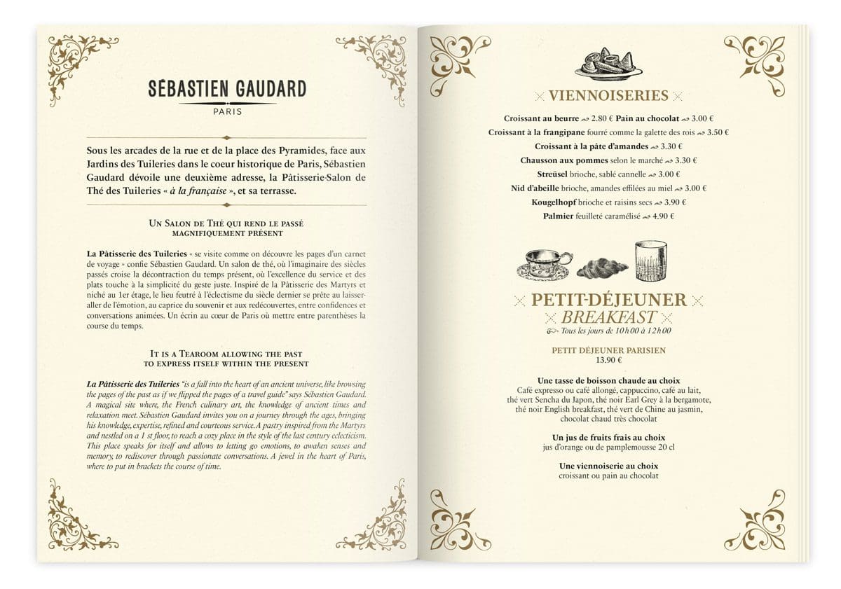 Pour illustrer l’excellence des douceurs sucrées et salées à la carte, le studio plonge dans son incroyable collection de gravures du XIXe siècle. Ils y sélectionnent avec soin une iconographie riche et pointue, en hommage au savoir-faire de Sébastien Gaudard. 12 pages d’amuse-bouche à déguster avec les yeux.