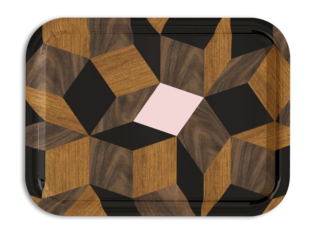 Des plateaux à géométrie folle. Nouvelle collection de plateaux Penrose. Après Penrose Stripes et Penrose Playwood, voici Penrose Springwood. Ici la marqueterie se parsème en aléatoire d'un losange rose poudré.