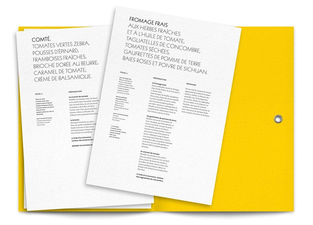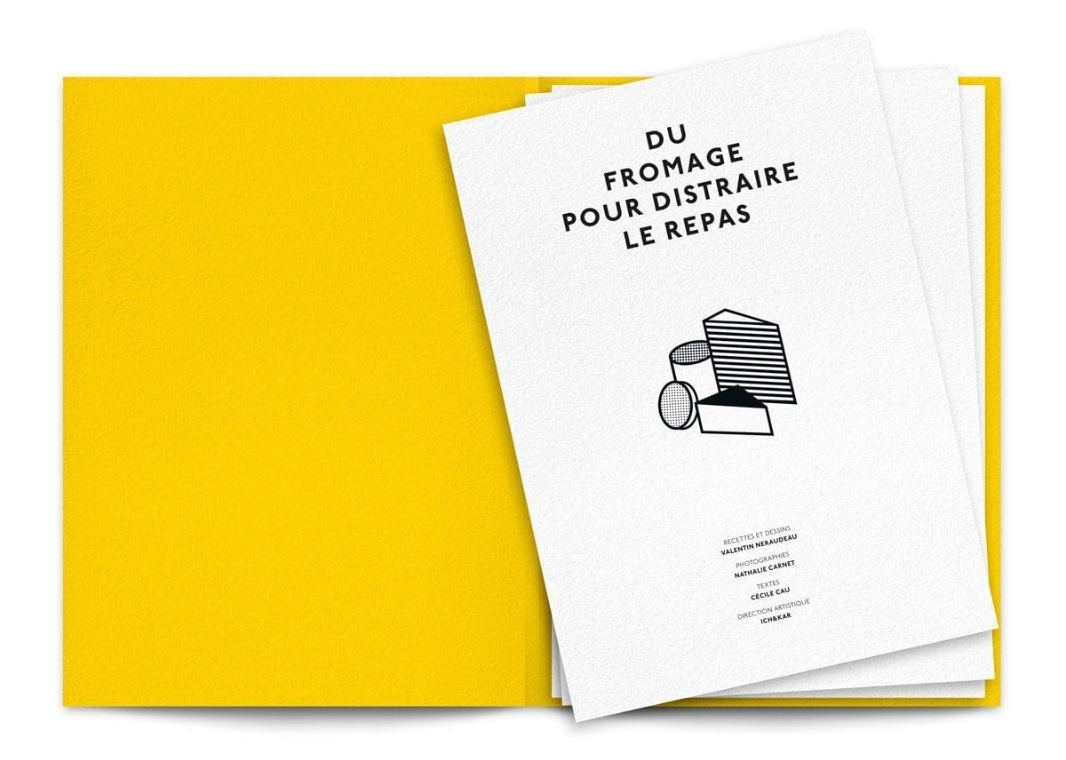 Photographiées par Nathalie Carnet, accompagnées de textes de Cécile Cau les huit recettes sont mises en scène par Ich&Kar. Les graphistes imagine un Portfolio Fromage moderniste, huit feuillets assemblés dans un poche à élastique reliure monocle… un objet solaire et gourmand !