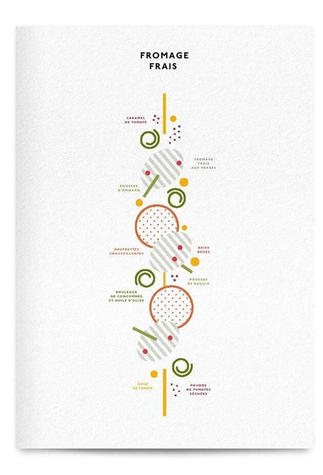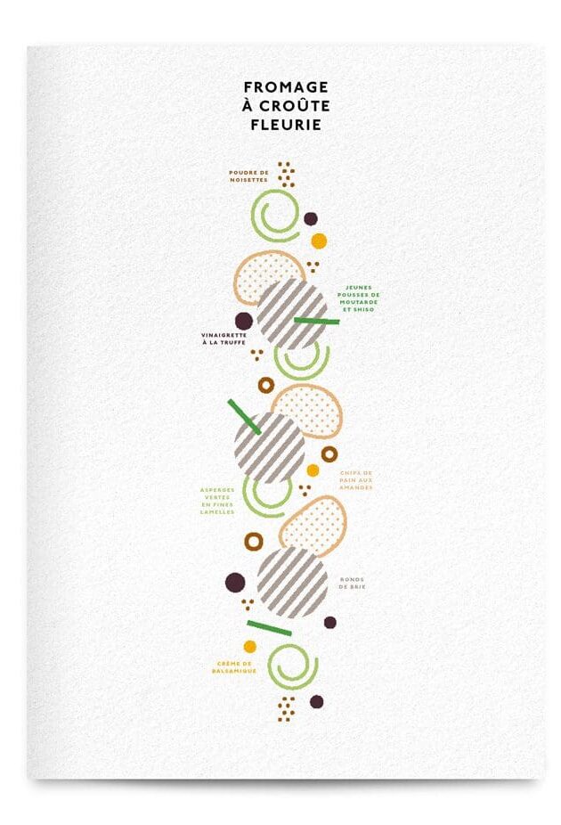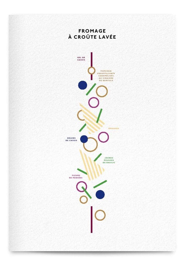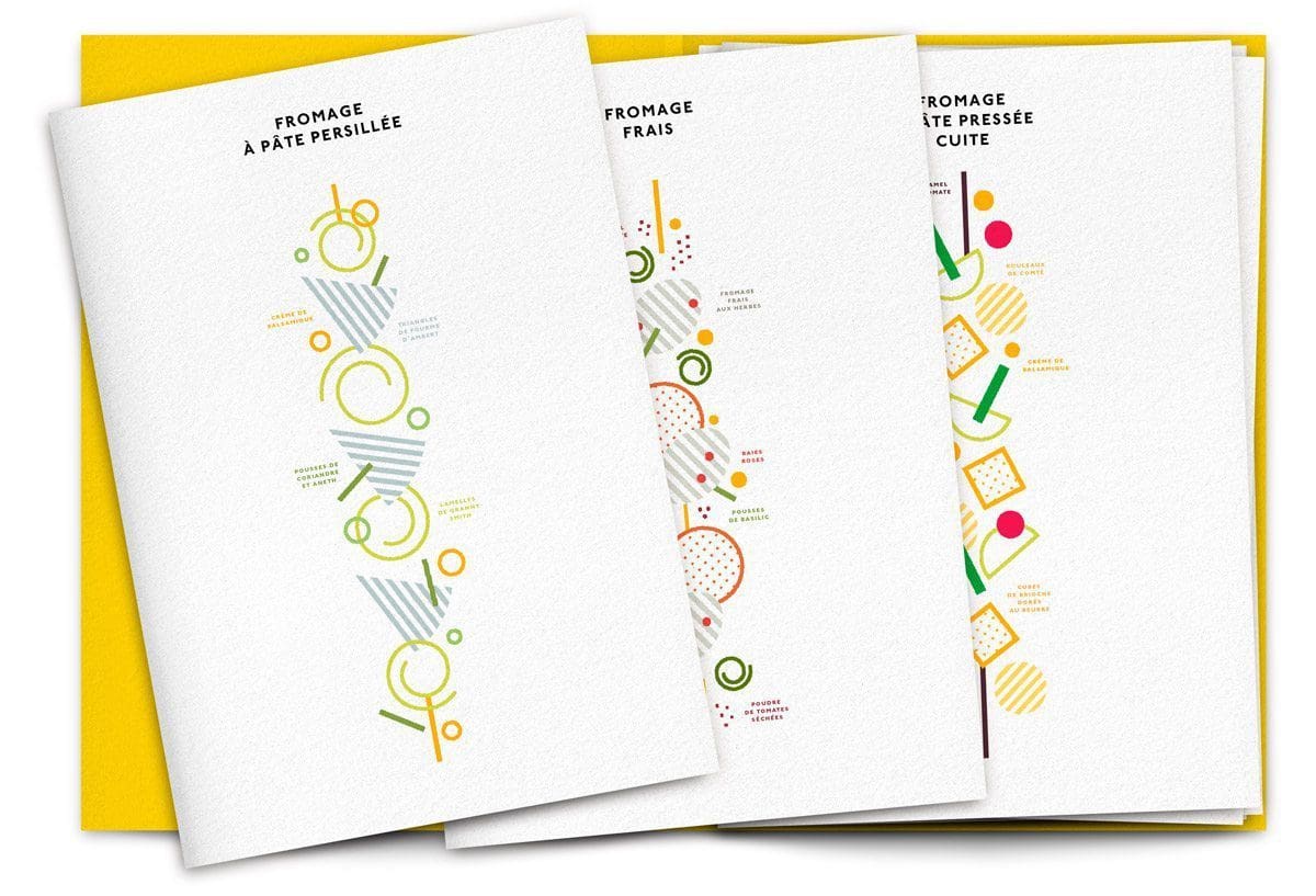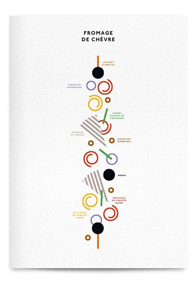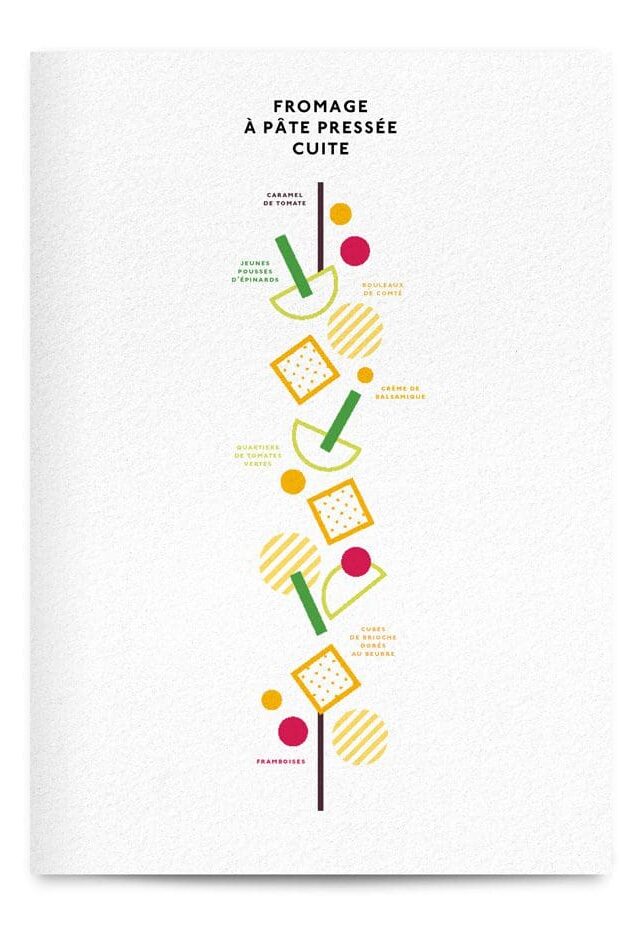 Ce sont les dessins du chef qui donnent l’inspiration à Ich&Kar. Les graphistes redessinent ces compositions fromagères dans une géométrie dansante façon Bauhaus et donnent au projet une identité moderniste et gourmande.