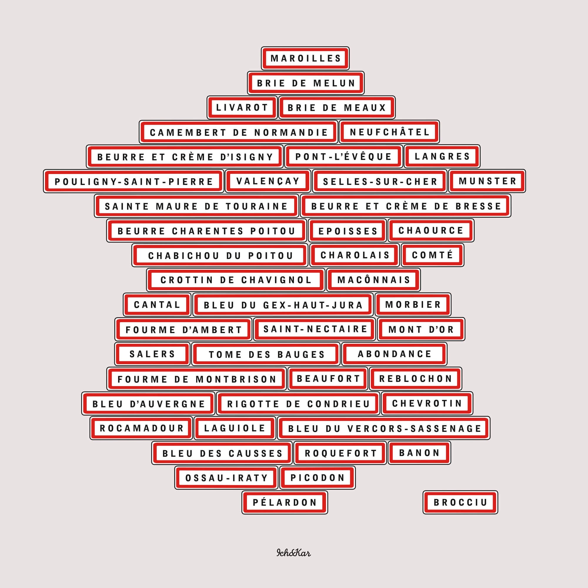 Ich&Kar et les produits laitiers, c'est une grande histoire d'amour. Alors pour célébrer cette romance, Ich&Kar met les AOP à l'honneur et réalise un papier peint où géographie rime avec gastronomie. Au menu, la crème de la crème de nos campagnes, 2 beurres, 1 crème et 44 fromages répondant au prestigieux label des Appellations d'Origine Protégées. Des panneaux d'agglomération au nom des produits forment une grande carte de France, pour un tour laitier de nos régions. Du salon de l'agriculture 2014 à la Crémerie de Shanghai en 2019 en passant par le French Cheese Board à New-York en 2016, un outil pédagogique et gourmand qui aura ravivé notre envie d'apprendre et de réciter avec appétit! Gare à l'interro surprise!