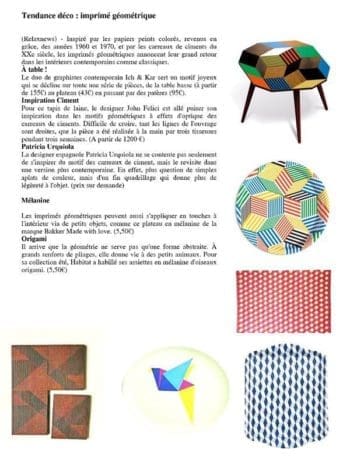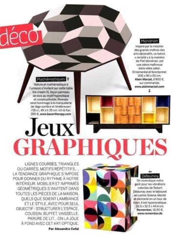 Le journal de la Maison consacre leur page créateur au duo Ich&Kar. Une partie de la collection Penrose, éditée par Bazartherapy, est présente. Papiers peints, tapis, plateau, table, sac, etc Un article de Céline de Almeida