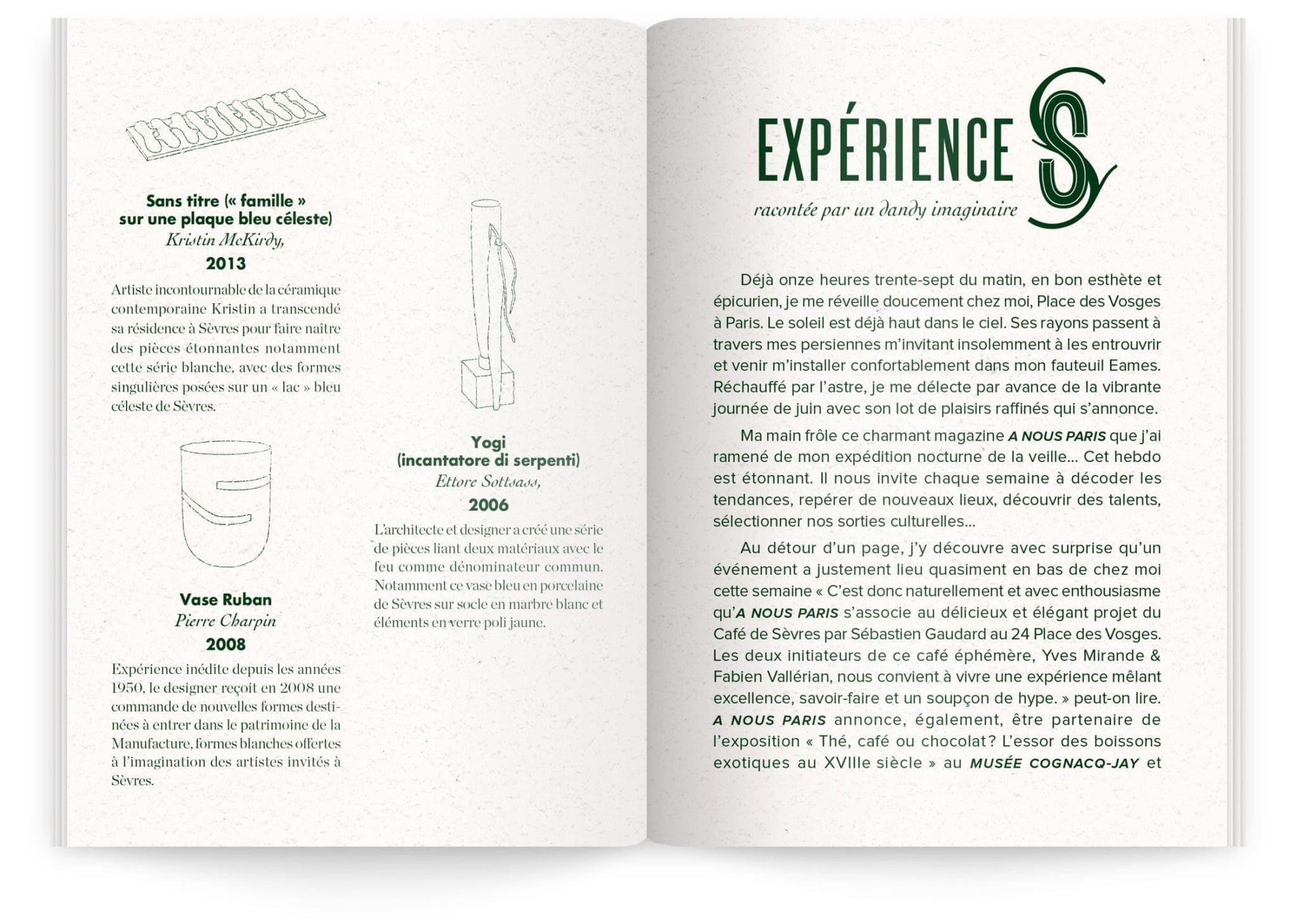Perfectionnistes jusque dans les moindres détails, Yves Mirande et Fabien Vallerian, les deux curateurs de l'éphémère Sèvres Café Sébastien Gaudard, souhaitaient une identité visuelle forte qui mêle un certain regard sur le XVIIIe siècle à une contemporanéité assumée.