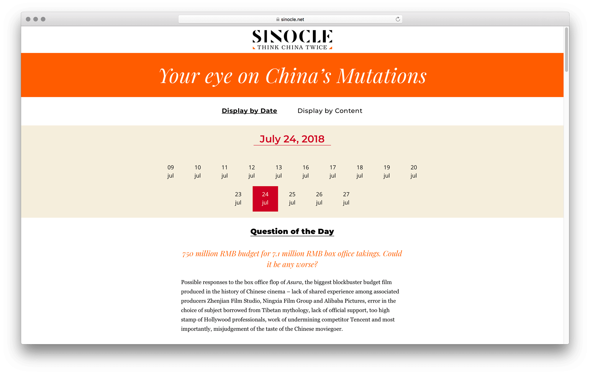 Sinocle est aussi disponible en version anglaise, autant pour la newsletter que pour les articles passés. Le site est parfaitement traduit, pour le bonheur des businessmans de la City ! Une prochaine version en chinois ? À méditer …