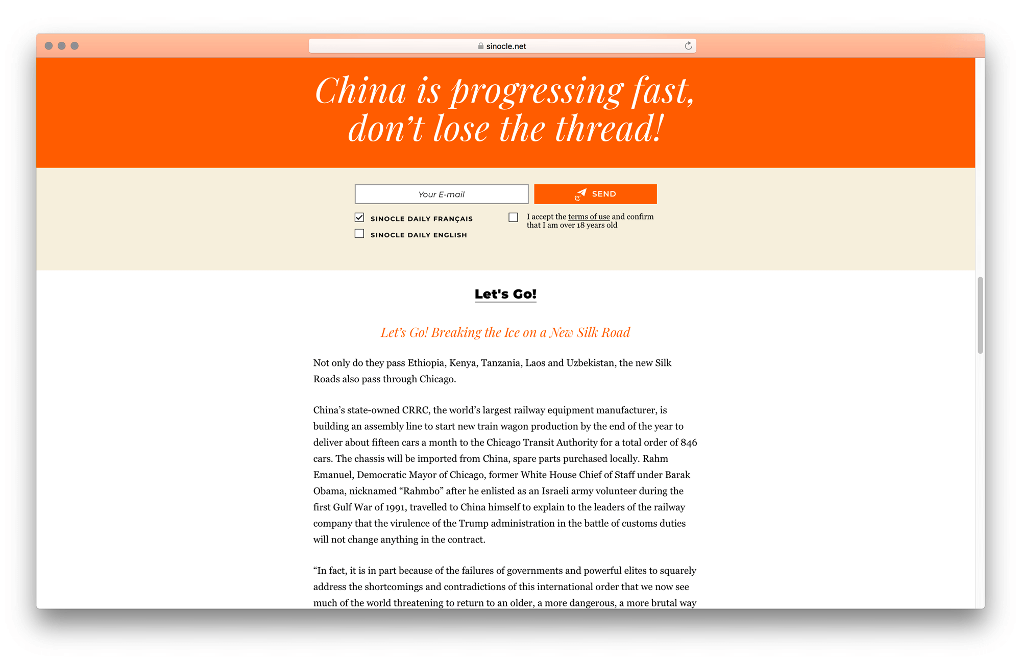 Les couleurs de Sinocle tranchent avec celles des principaux médias français, et sont également différentes de celles des sites ostensiblement tournés vers la Chine. Sinocle est élégant et moderne. Le soin graphique apporté, permet d’ailleurs de le rendre attractif sur les réseaux sociaux. Un bel orange lumineux dans votre boîte mail ? Oui, c’est bien la newsletter Sinocle qui est arrivée !