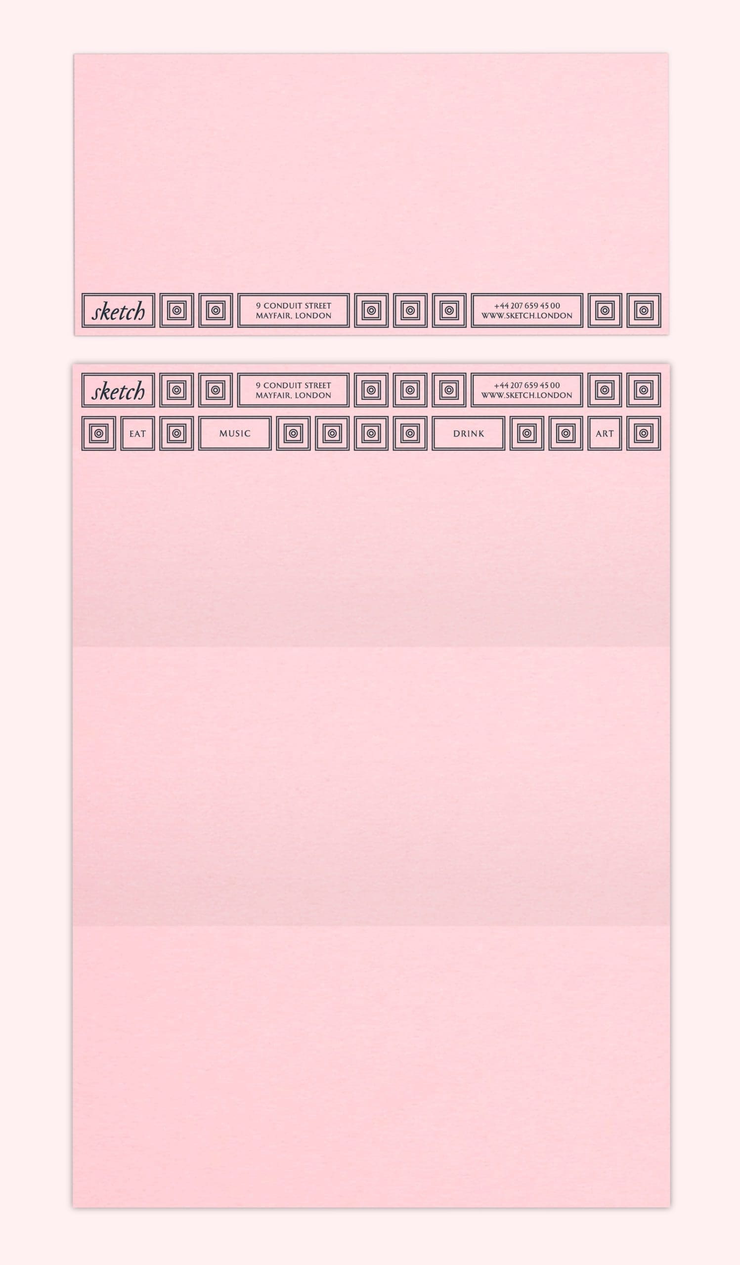 La papeterie du restaurant Sketch à Londres. Papier rose poudré pour les têtes de lettre et la carte de correspondance, design Helena Ichbiah